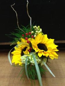 Sunflowers, Hypericum Berries, Mini-Hydrangea, & Curly Willow